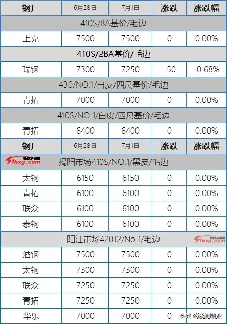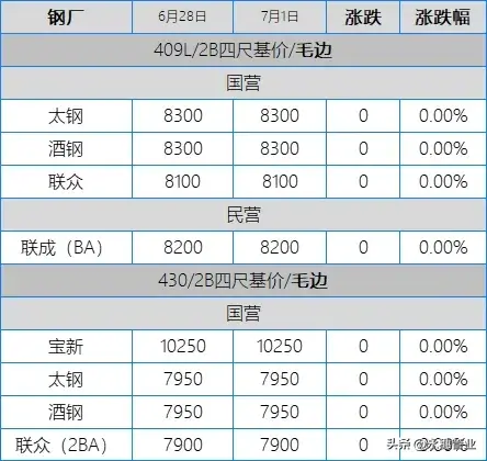 目前市場(chǎng)主流報(bào)價(jià):410S熱軋黑皮在6100-6150元/噸;430熱軋黑皮在6700-6800元/噸;太鋼/酒鋼430/2B(毛)在7950-8000元/噸;聯(lián)眾430/2BA(毛)在7850元/噸左右;宏旺430/2BA(毛)在7750-7800元/噸;甬金430/BA(毛)在8350元/噸左右;上克430/BA(毛)在8350元/噸左右;宏旺430/BA(毛)在8150-8200元/噸;瑞鋼430/2BA(毛)在7700-7750元/噸,其中期貨價(jià)在7800元/噸左右;聯(lián)成430/BA(毛)在8200元/噸左右。