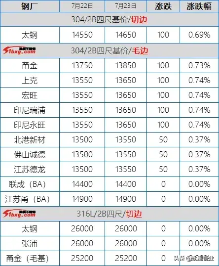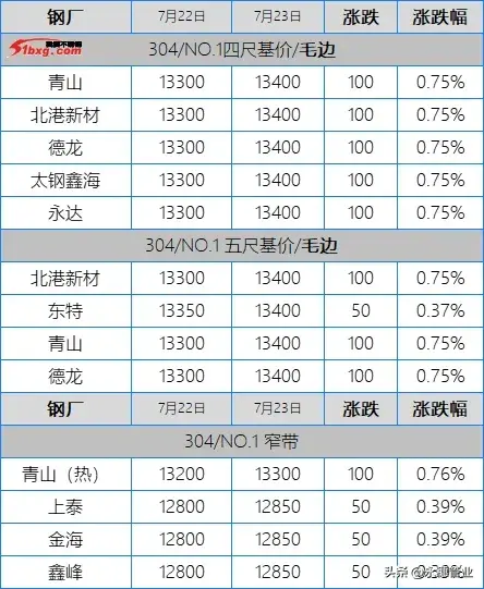 今日,青山鋼廠盤價(jià)漲100:熱軋窄帶13300元/噸,熱軋大板13400元/噸。旗下代理雖有跟高報(bào)價(jià),但仍有讓利政策,具體報(bào)7月資源:鼎信304冷軋窄帶13200元/噸,熱軋窄帶13300元/噸;30478冷軋窄帶12700元/噸。304熱軋大板13430元/噸,30478熱軋大板12900元/噸。