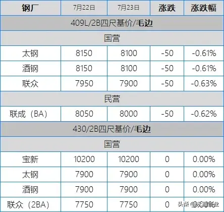 目前市場(chǎng)主流報(bào)價(jià):410S熱軋黑皮在6100-6150元/噸;430熱軋黑皮在6700-6800元/噸;太鋼/酒鋼430/2B(毛)在7850-7950元/噸;聯(lián)眾430/2BA(毛)在7700-7800元/噸;宏旺430/2BA(毛)在7700-7800元/噸;甬金430/BA(毛)在8300元/噸左右;上克430/BA(毛)在8250元/噸左右;宏旺430/BA(毛)在8100-8200元/噸;瑞鋼430/2BA(毛)在7650-7700元/噸,其中期貨價(jià)在7800元/噸左右;聯(lián)成430/BA(毛)在8200元/噸左右。