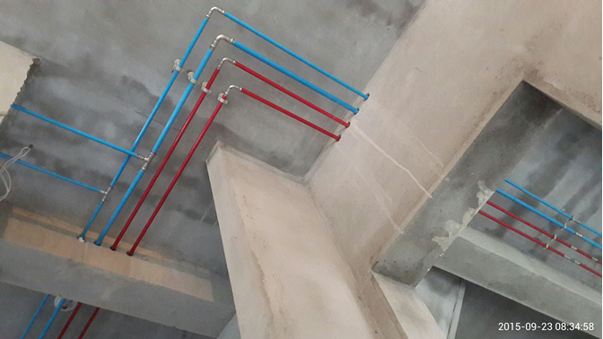 驗收技巧:禁止把水管壓在管線上面,首先要分清水管和管線。支架入墻處標有紅線的水管是熱水管,標有藍線的水管是冷水管,較細的純白色管是管線。