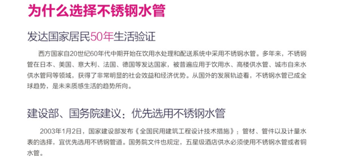 4.衛(wèi)生安全,在水管材質(zhì)中,不銹鋼是公認可以植入人體的健康材料;